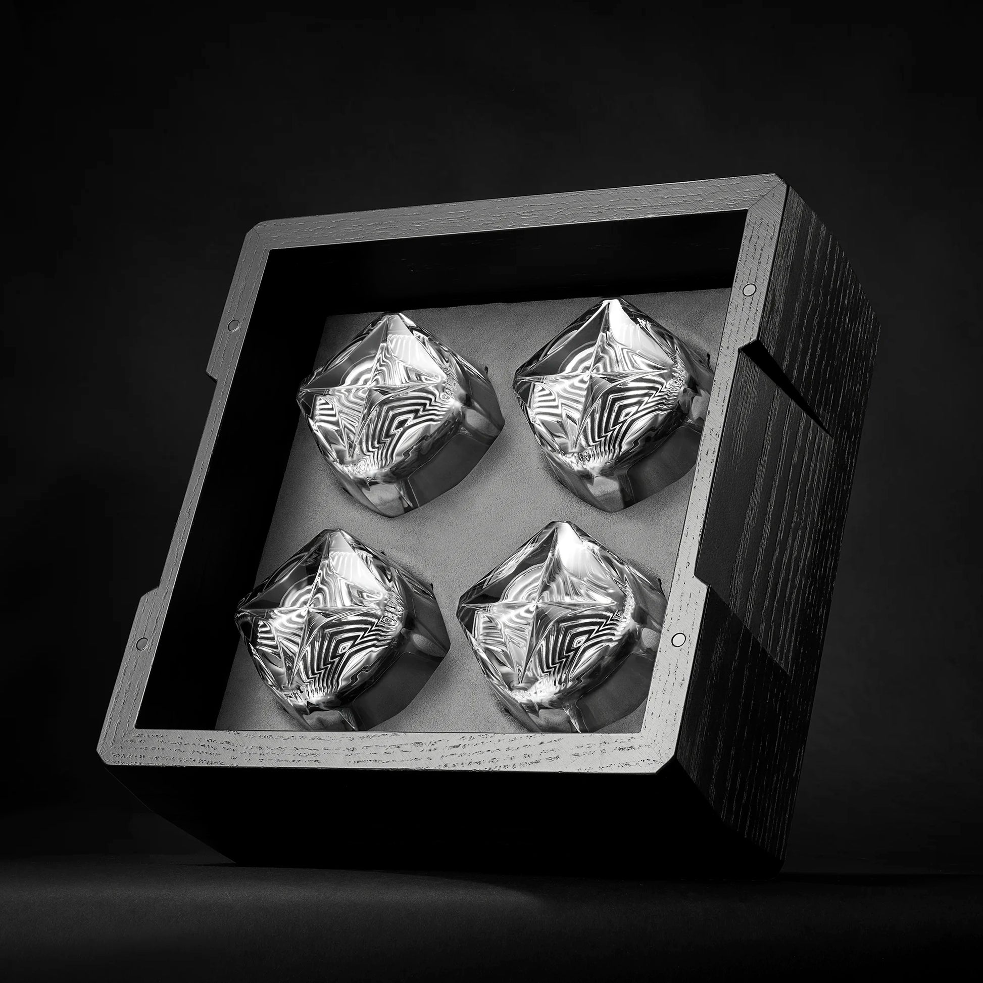 Inside, a soft-touch, dusty-grey vegan leather insert holds each glass in place like a gem set in fine jewelry. The inverted glasses are cradled in silos, shielded by a flush, removable lid secured by blackened rare-earth magnets—subtly hidden but undeniably firm.